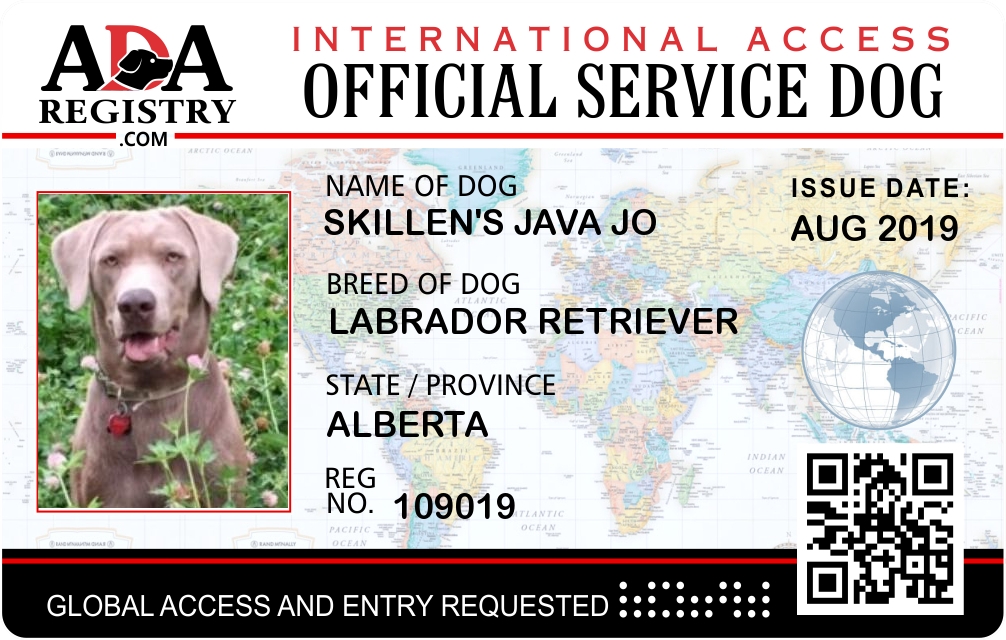 International Service Dog Registration for Skillen’s Java Jo