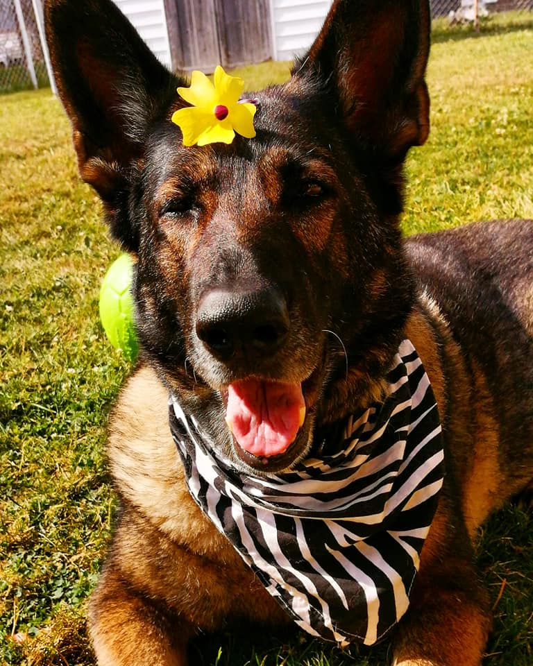 laying in the yard with pretty flowers in her hair, this is my best friend, she is pretty and good , dog dog doggy days…..