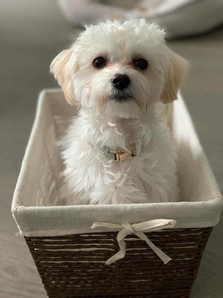 Bean sitting patiently in a basket for photo to be used for service dog registry…………………………….