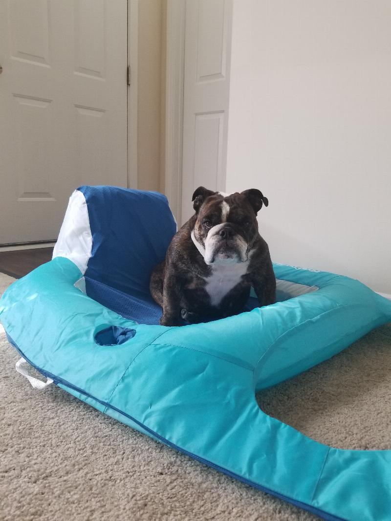 Bella is an Emotional Support English Bulldog. She has her own panic attack if she is excited or exhausted. She has a son who she lives with and a sister.