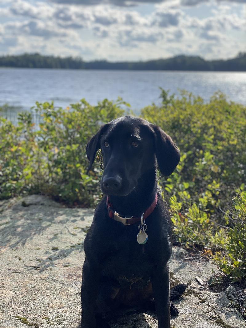 Bella guiding Sven on a hike, she is working here on the trail in Adirondack Park in New York State. Bella is an attentive, kind animal.
