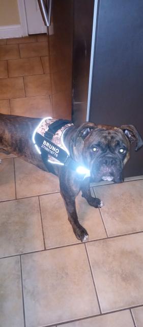 This is Bruno my American Boxer , he is a year old and he helps me stay calm. He loves lay on me no matter where I am, and he also loves both of my sons.