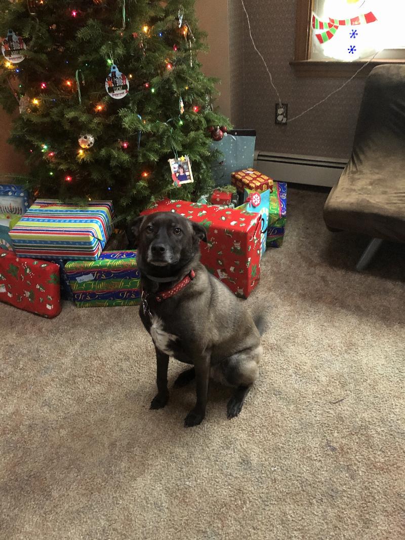 Cali a black lab mix with white spots is showing her Christmas spirit. She got a little bit bigger weighing around 50 pounds now.