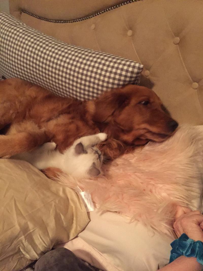 Cami is taking care of our new kitten Bon Bon. She snuggles with her to let her know that she has her back too! They have such a special bond.