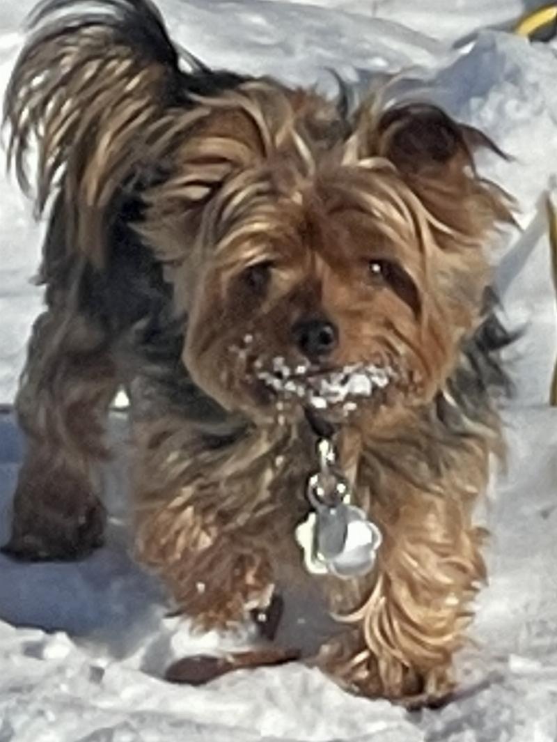 Casper having fun in the snow and guarding me from the Wildlife around his home. He loves to run, being outside with me, truck rides are great with him and is very protective of me.