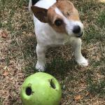This is our beautiful, blind, fostered, and then adopted rescued Jack Russell terrier. She loves her ball because she can hear it as it rolls and she can move it with her nose. She is like a soccer player with her ball and is obsessed with it.