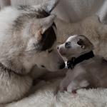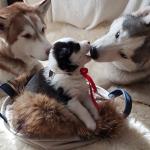 Papa Doctor, beautiful mom Luna and their daughter…Actually, they have 5 puppies: 4 girls and one boy, born paralyzed…3 girls have brown eyes, 1 girl have one brown and one blue eyes, and the boy have blue eyes. Our Doctor is the best father ever!