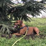 Artemis lying down under a tree after some exercise. She is wearing her Ruffwear harness. Her energy is calm and relaxed after exercise.