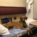 This is Artemis on the sleeper train from Moscow. She loves having a bed to relax on. She is well-behaved when she has her own space and calm surroundings.