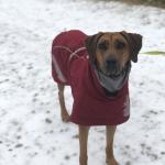 Here is Artemis in her winter jacket. She warms up easily and doesn’t mind the cold, but we got her a jacket because the winters in Moscow get so cold.
