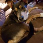She laid across the room smile we’re eating supper but as soon as we finished she lifts her head and had a peice of paper stick to her face from her drooling while she was waiting for a treat.