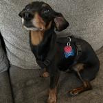 Ollie is a miniature pinscher service dog for owner Lindsey Banis. Born- unknown Estimated 7 years old. Adopted March 2022