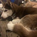 Nikita is Laying on the Couch in the summer red white female husky…………..love her………..great with kids and other animals!