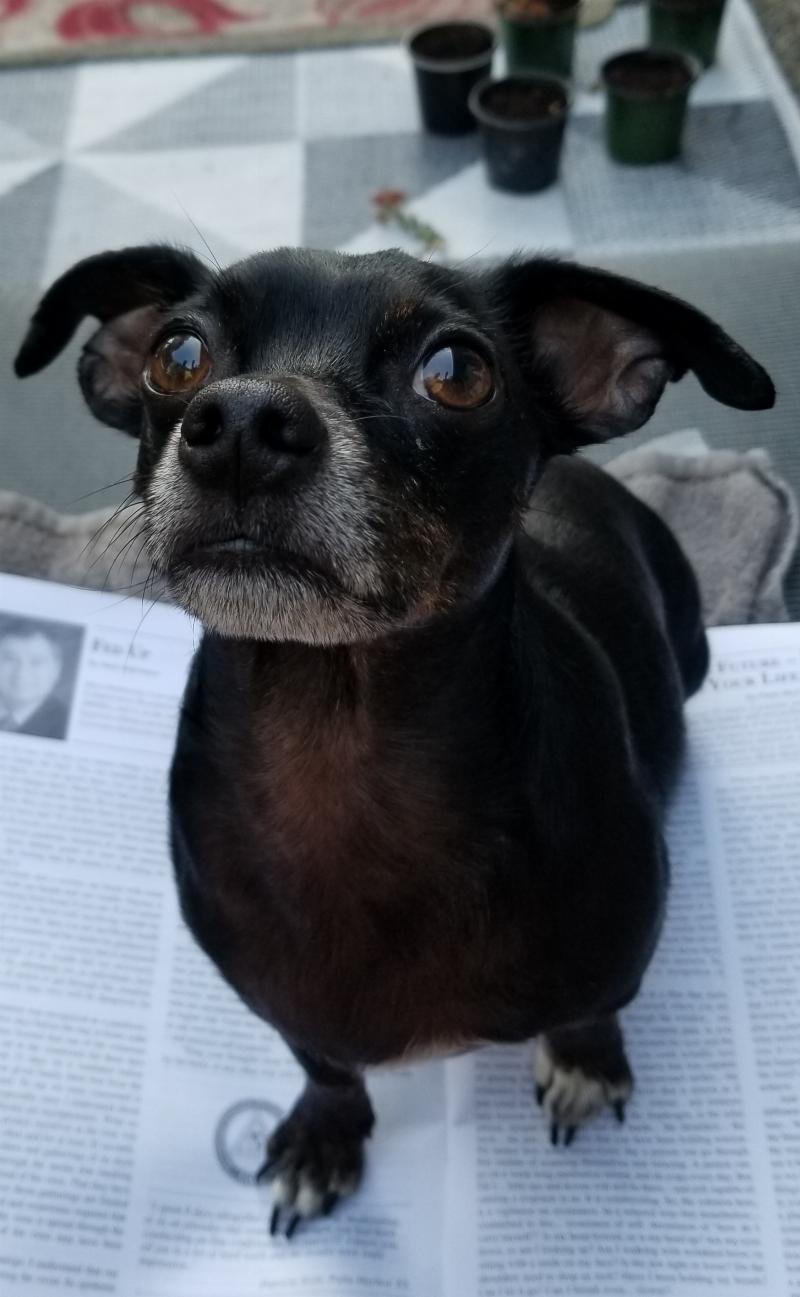 Nugget loves to sit with his family after we got home from work, on our days off, and any time he can. He always greets us with one of his favorite toys. He knows each one of his toys by name. Nugget is a very smart and alert dog.