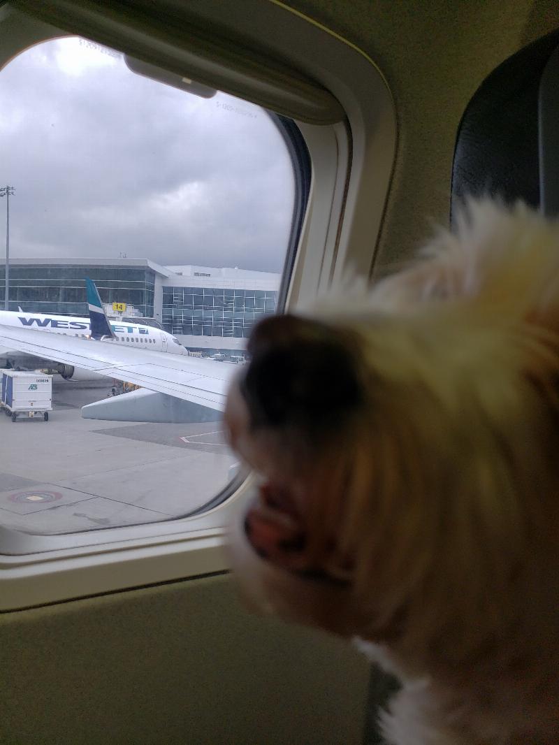 This is Roxi enjoying her window view flight from Calgary to Vancouver. She sat there quietly was loved by all the fkight attendees on our Aesjet flight.