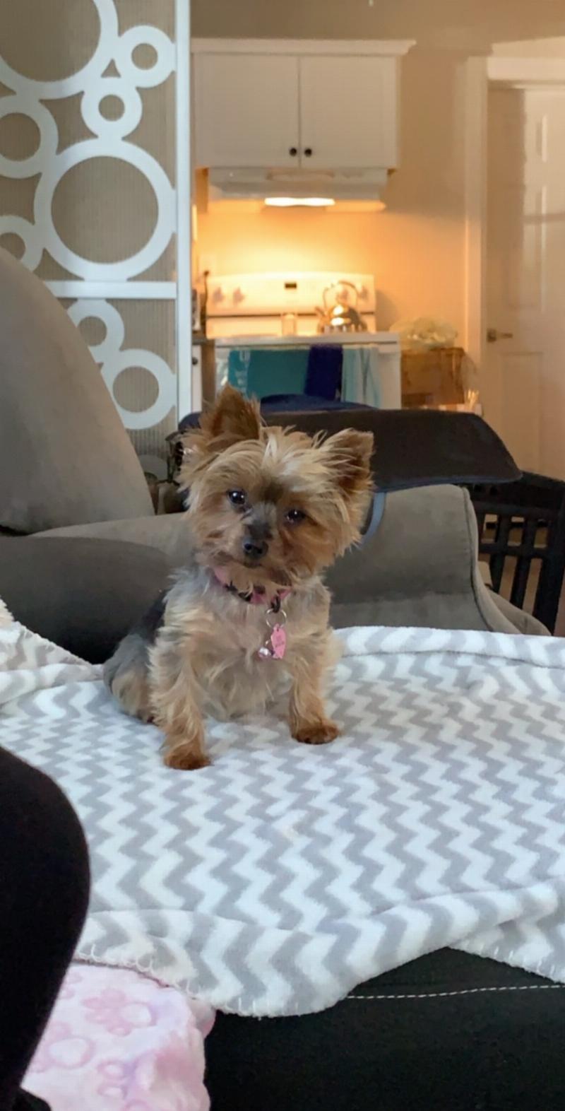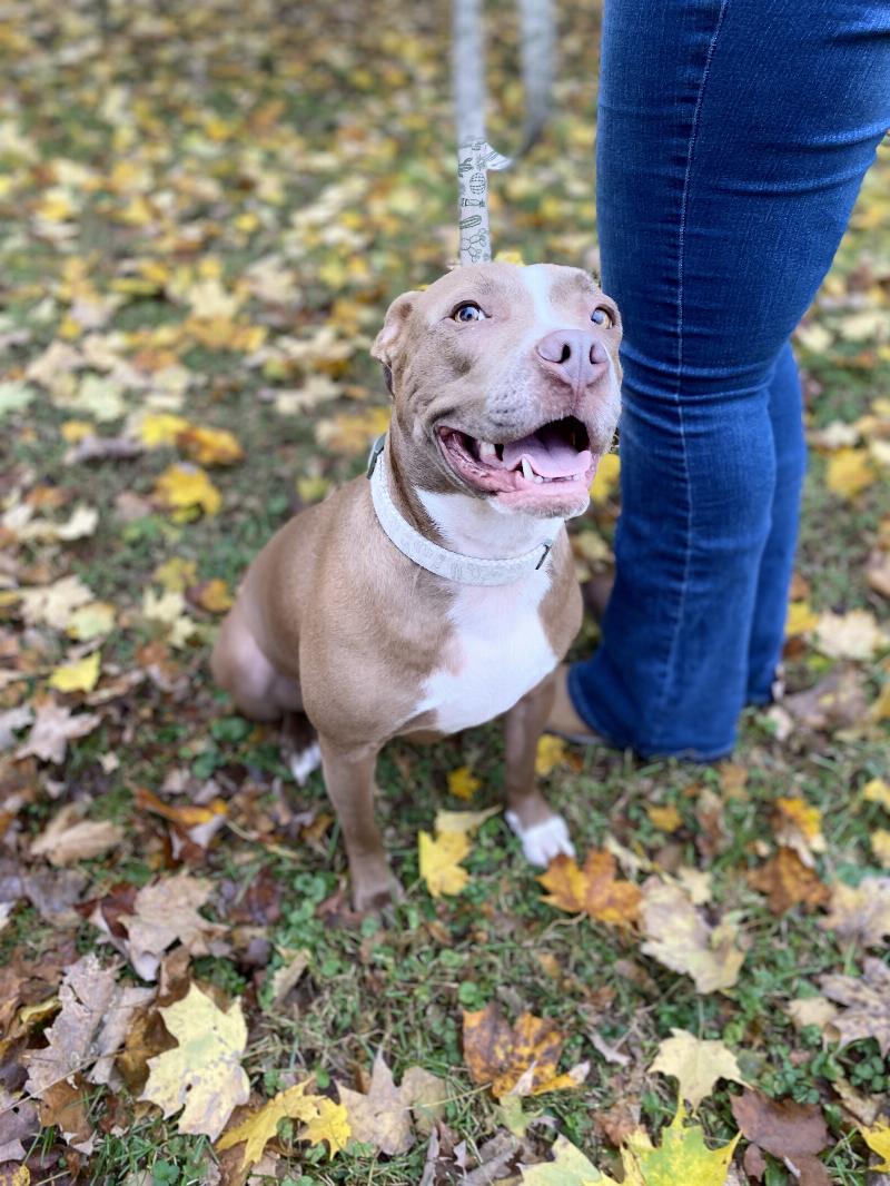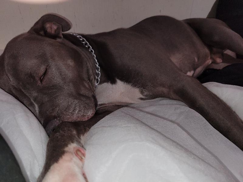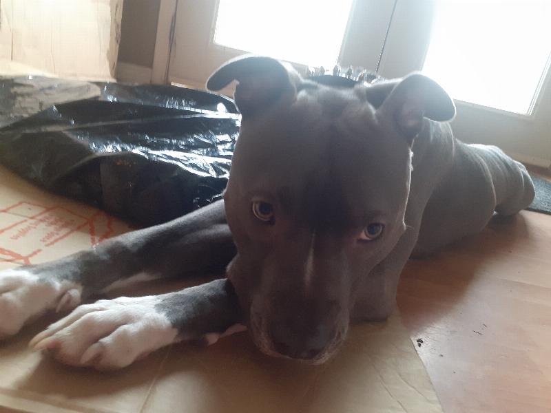 This is a picture of Tia and my husband, Ben. She is always by his side making sure that he is doing ok. When she notices changes in Ben’s behavior she immediately goes to him and snuggles his legs to distract him from the given situation and calms him immediately.