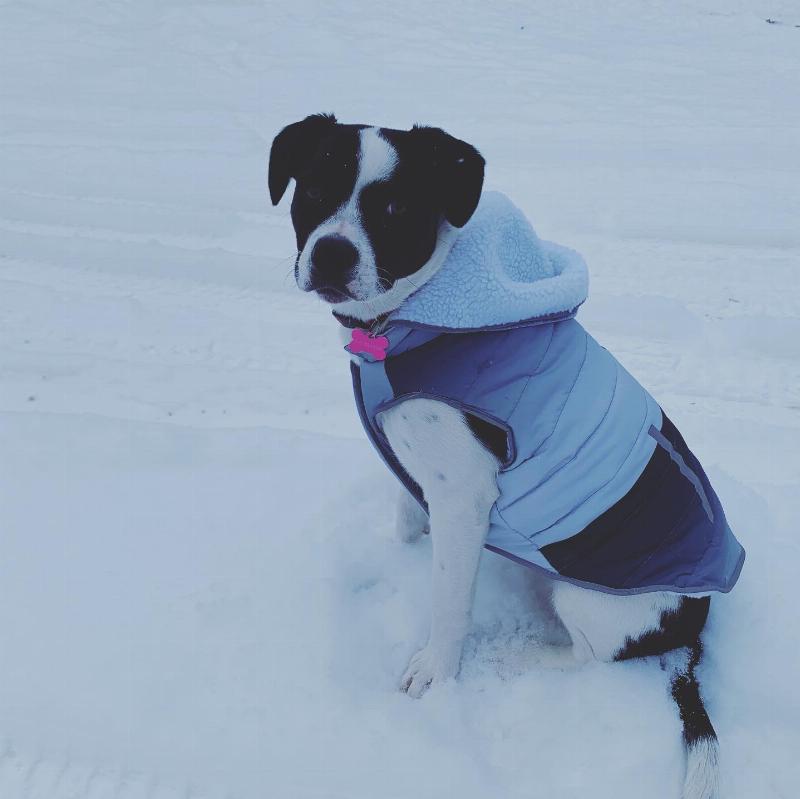 Maggie doesn’t like wearing her coat, but it keeps her warm in our cold Canadian winters. She likes to run beside me while I am snowmobiling.