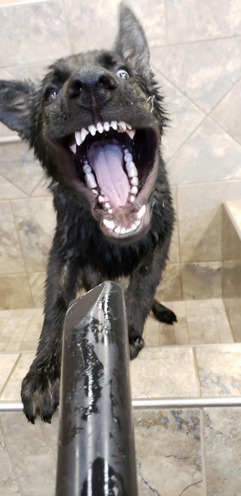 One of Milo’s first baths and getting his hair blown dry at our local PetSmart, they just love him there and he is there Store Mascot.