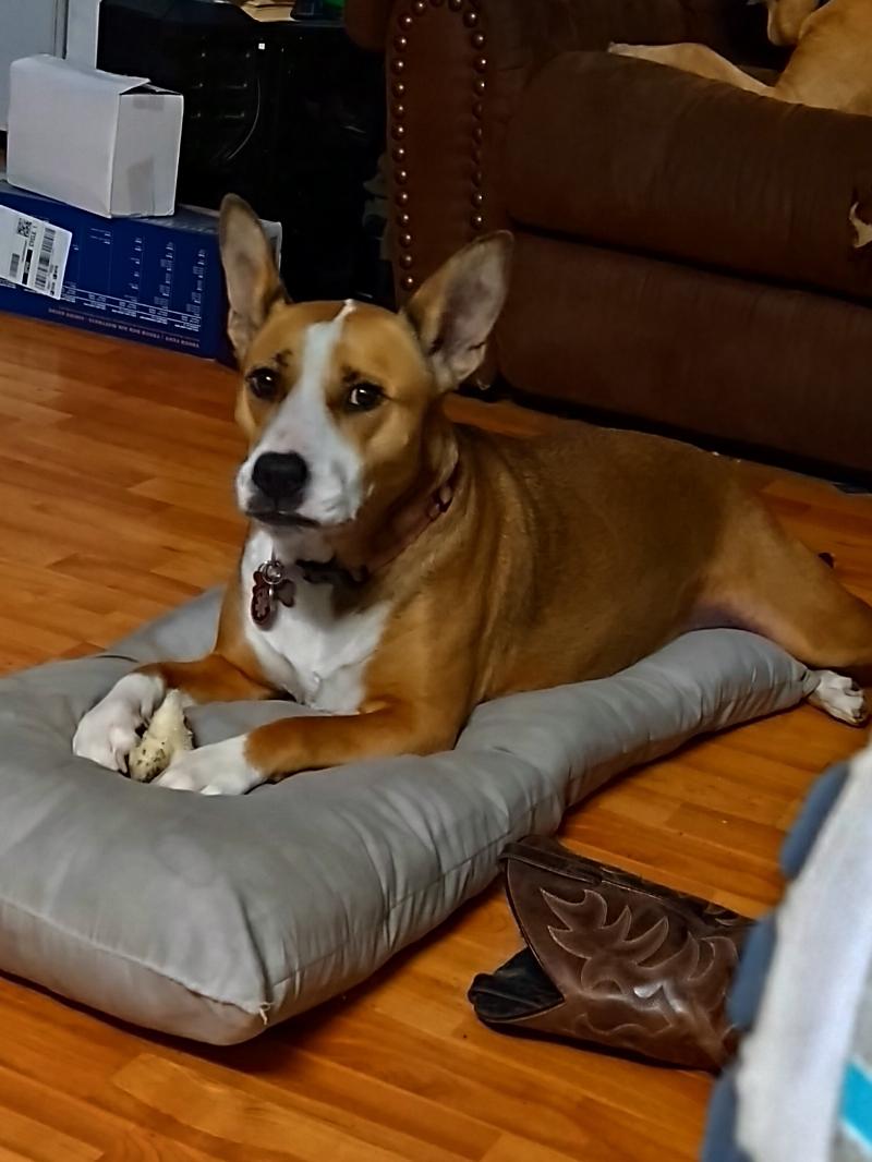 What Karma looks like now. This is my big girl. She has very distinct markings. She is always training for her job. She is my ptsd service animal.