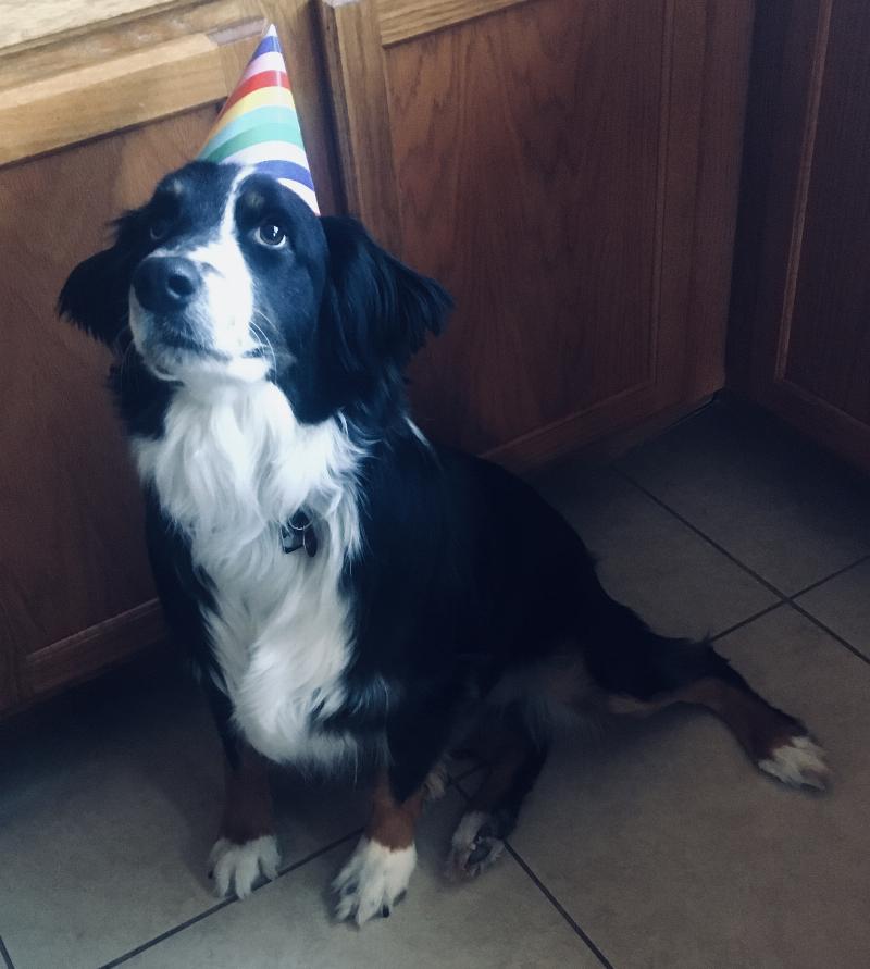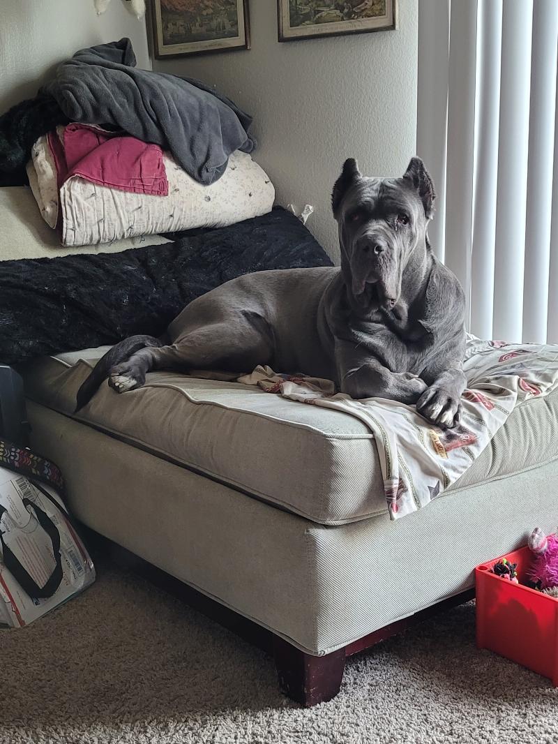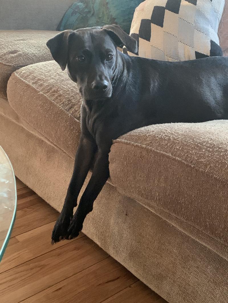 Gaia sitting on the couch looking over at me. She sits in the most peculiar positions, but she’s a good dog/ helper. She’s my everything.