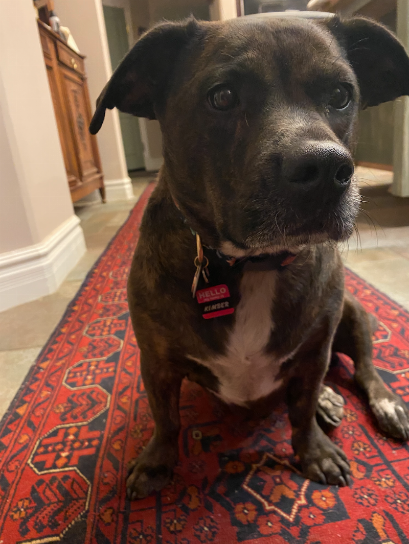 This is Kimber she is very sweet and kind. She is a Staffordshire Terrier who loves to go on hikes and sleep in. She does a perfect job of reminding her mom to take her daily medication.