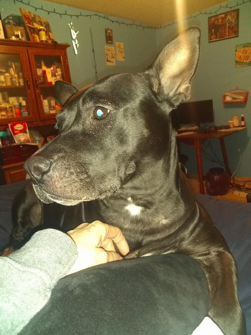 Midnite is protective yet so lovable. She can look mean but I know the difference in her tones. She loves kids, and pays attention to adults.