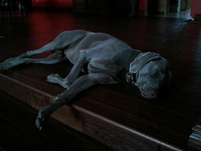 Blue relaxing and waiting for us to get home, very well trained dog and is my fourth weimaraner and love the bread. they are very smart and easy to train if you know what you are doing.