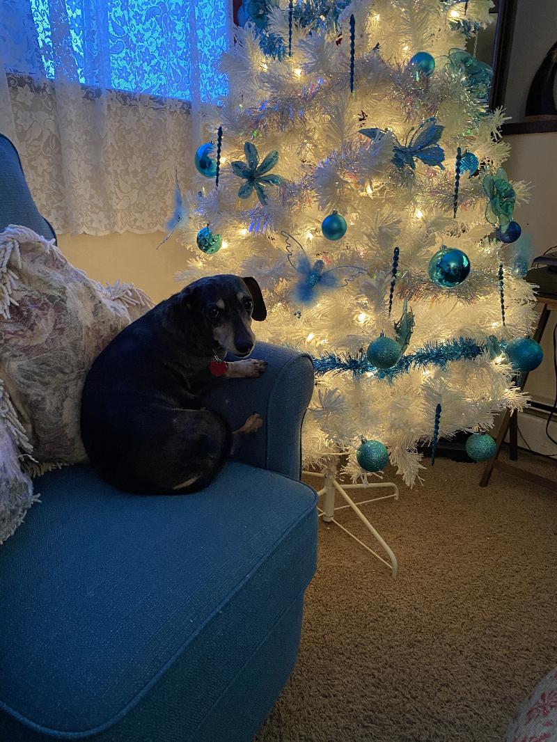 Oscar enjoying the Xmas tree 2020. Maybe it was because it was the first time I have used a white Christmas tree but he would go to the recliner chair and look at the lights.
