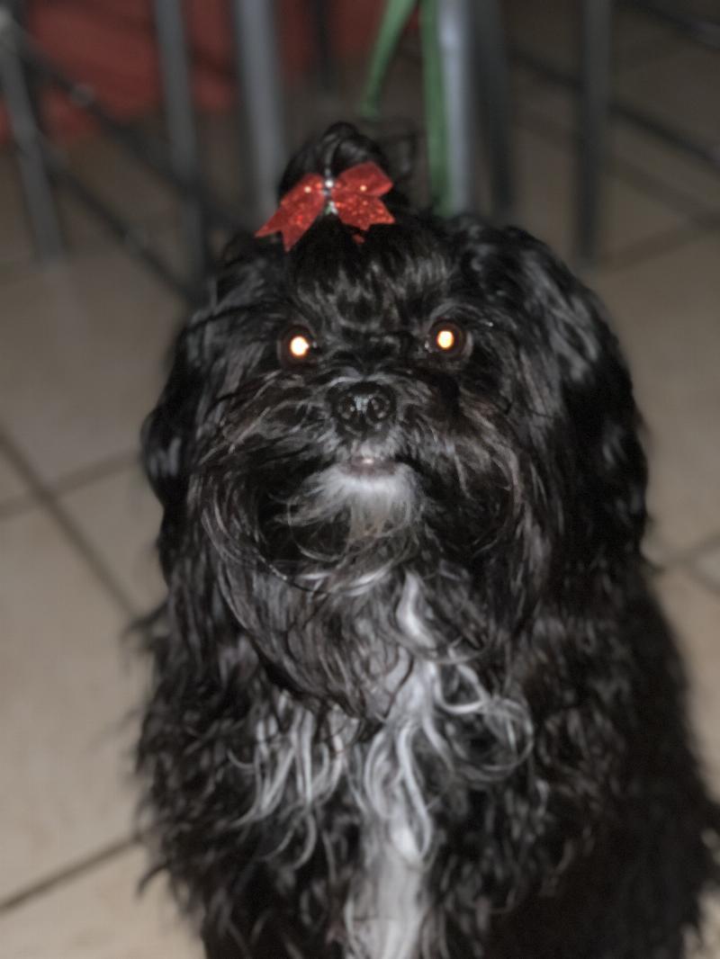 Born in December 2019. Neutered, Male, Yorkie and Shitzu mix. Registered as an Emotional Support Animal and a Service Dog. Small breed. Marking all black with a small white patch on chest and on top of his head.