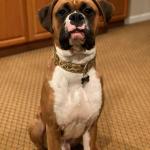 King, male, purebred boxer: fawn, white paws, and white along the center of his mask – one small patch of white in the shape of a star on the back of his neck.