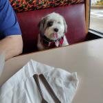 Patches eating out in Black Bear restaurant. She loves smelling the food & seeing other people. Patches is well behaved & knows never to put her feet on the table. She smiles & waits for someone to tell her that she is cute.