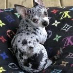Little Miss Bailey is a small 3 pound female chihuahua who is white with brown patches all over and black mask on her face.