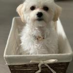 Bean sitting patiently in a basket for photo to be used for service dog registry…………………………….