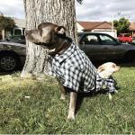 Dallas and Hercules. Both in their matching plaid button up t shirts. Posing in front of the big tree n the front of the house.