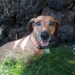 Honey is 11 years old as of 2/18/2022 She looks like a large dachshund red in color grey on her face