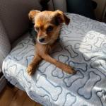 Photo of Oshki sitting cross-legged on a large chair with a blue blanket that has dog bone designs. Oshki is sitting pretty.