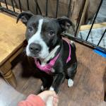 Bella is a black and white Pitbull that is sitting and shaking hands. She is very friendly and helps Lailani with her anxiety.