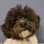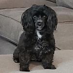 Black Toy Poodle, easy going, quiet unless she hears knock or doorbell. Always alert to my triggers of anxiety & ready to assist