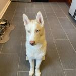 Kimba colombonis a Siberian husky white/ red with blue eyes. She is a medical alert service animal to assist me with cortical dysplasia