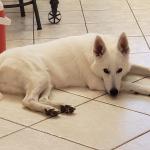 Casper is an 86 pound female. Non aggressive white German shepherd. she’s chipped in her neck. She is trained to assist in support as well as physical support ie… picking up objects, carrying and identifying wounds and other illnesses.