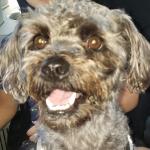 This photo is of our emotional support dog, Iris. She is a black, grey and brown poodle mix that we rescued from the pound.