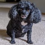 Star is a Toy Poodle party dog Black with white on chin, and chest, and some grey on ears and turning grey from age.