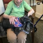 This is one of many photos of Stetson on a therapy visit. Residents hold him, pet him, brush him, hug him, kiss on him. He has been visiting facilities since he was only 4 months old.