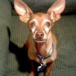 This is Franky posing for a picture. He is a Deer Head Chihuahua. He weighs 4.5 pounds and he is tan in color with a white streak that starts on his forehead and ends at his tail. His chest is white and he has white circles around his eyes.