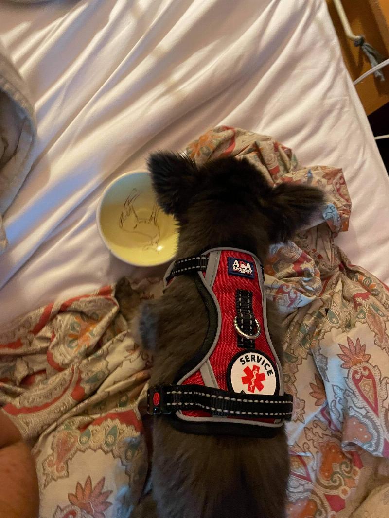 This is Charlotte and her service animal fast that i received. Once I received it I put it on her so that she could try it and she loves it. So far with the stay at home order we haven’t been able to go out places with her harness but I have taken her for walks around the block with it on. Once things start to open up then hopefully I can take her more places and more places will see that she is a registered service start right away.