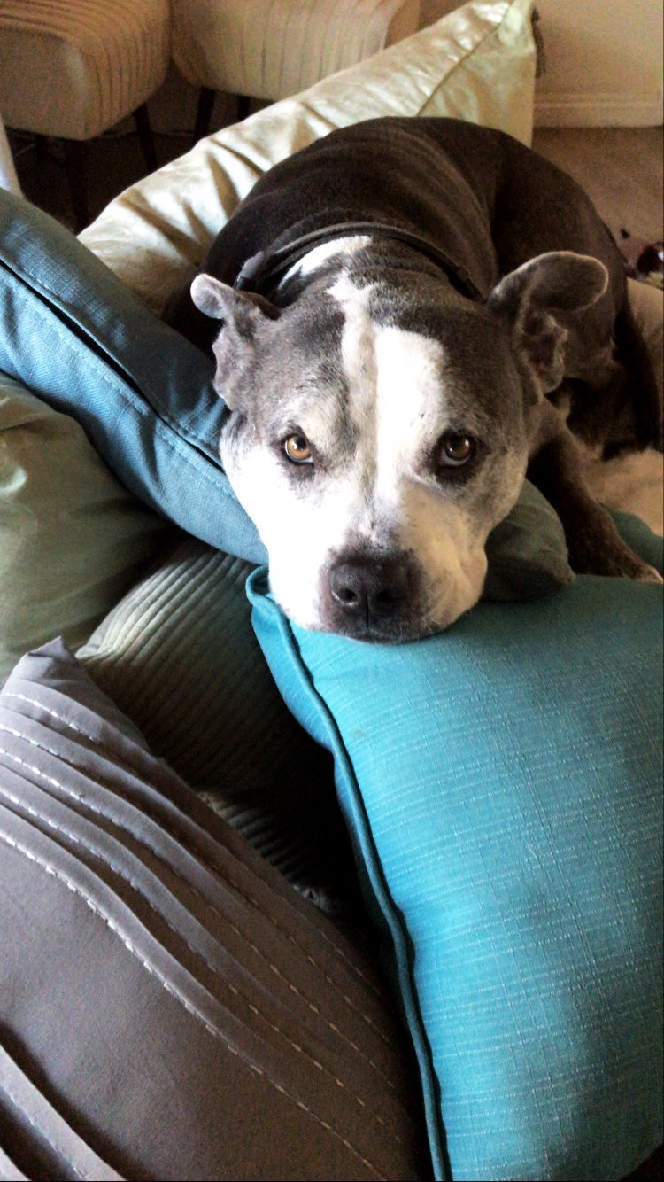 Chief is grey and white laying down in this picture he has yellow gold eyes and about Eight years old in this picture