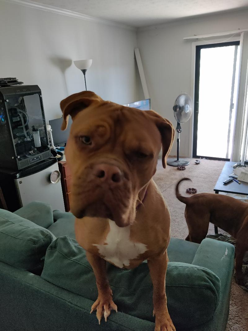 This is Dega standing on the couch. He likes to tilt his head when getting his picture taken. Talla is standing in the background.
