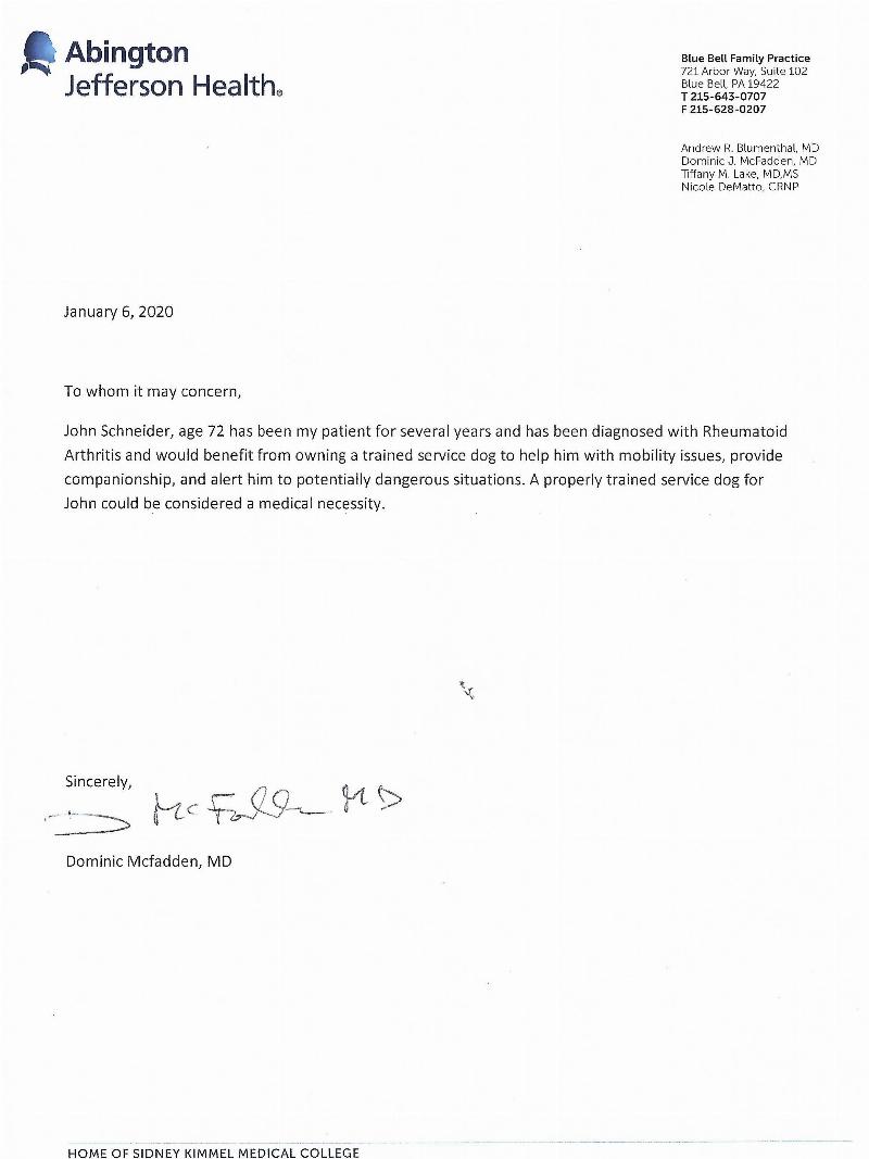 Doctor’s Support Letter for my Service Dog Renny
