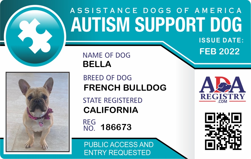 Member Since Feb 2022 Bella offers emotions support for her nonverbal handler who was diagnosed with Autism at 18mo.. Since the purchase of Bella, she has provided social/ emotional understanding, security, comfort, communication and use of language. She not only his his companion but an awesome member of the family.