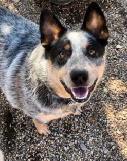 Is a Blue Heeler who is very social and super friendly. Her duty and service to handler is to recognize her handlers emotional state and too direct her handler by blocking her owner from moving forward and proceed to direct her handler away from a crowded area to a more calm, and safe place.